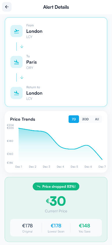 - Track routes and dates- View price trends visually- Get notified on price drops- Book via verified partners