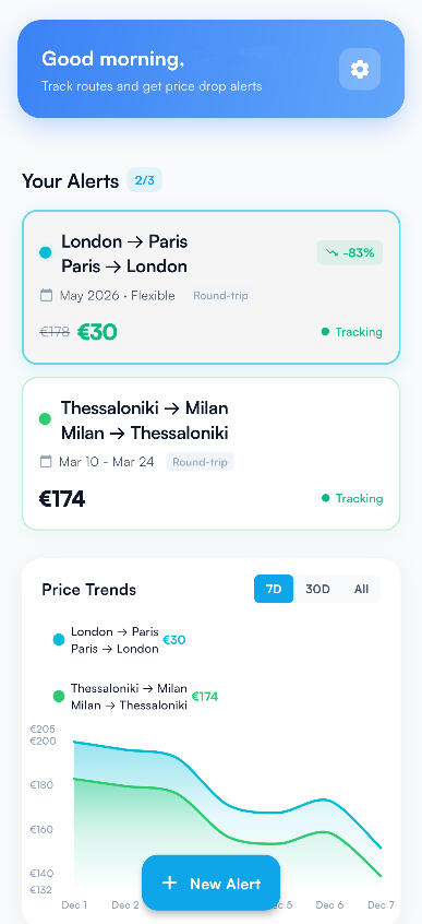 - Track routes and dates- View price trends visually- Get notified on price drops- Book via verified partners